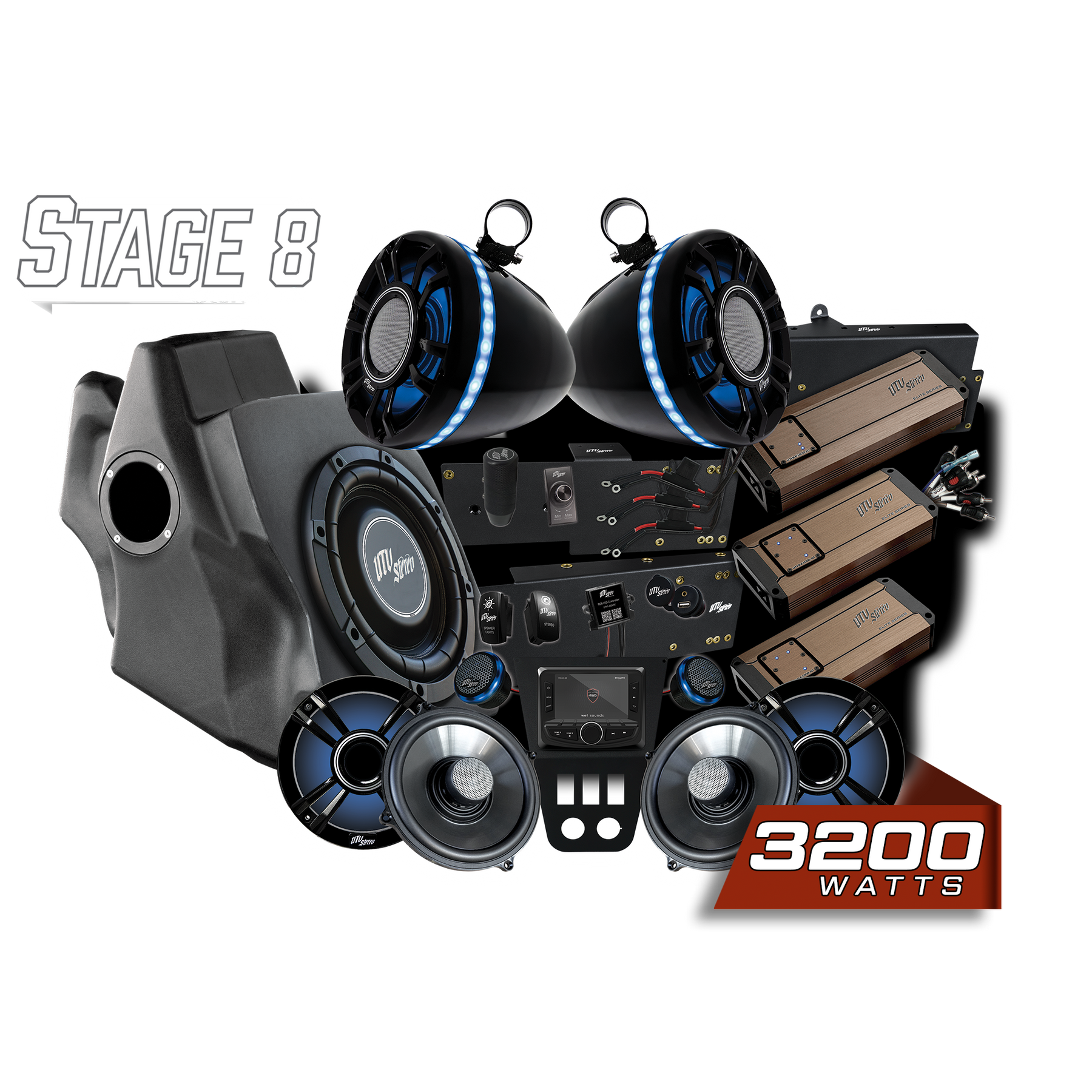 With three IP67 element ready amplifiers we push 500 Watts RMS to EACH speaker and 1200 Watts RMS to the subwoofer for MAXIMUM output and clarity. The Stage 8 system is extremely loud and engineered to cut through wind and engine noise like no other system on the market.