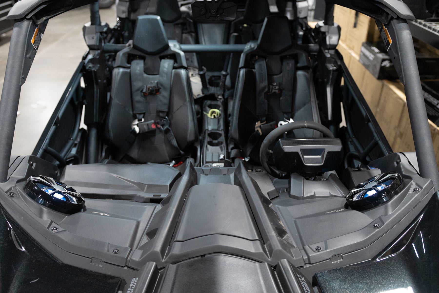 Our 6.5” dash panel enclosures were designed to put the speakers up at eye level so that you get the best sound stage possible. They are a direct factory/OEM fit so they will not interfere with any aftermarket cage bars or windshields. They feature the same textured finish and color as the factory interior.