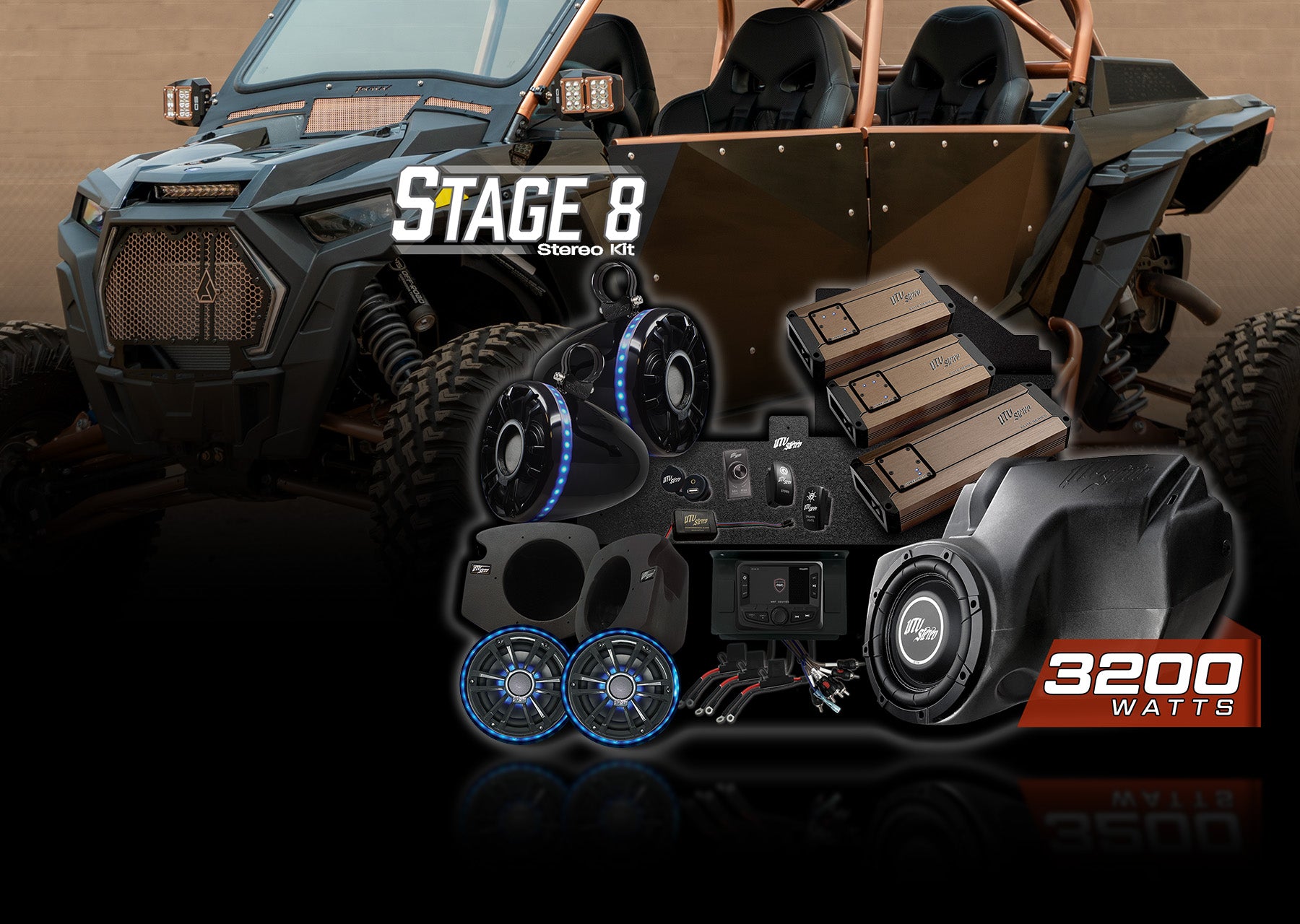 UTV Stereo Signature Stage 8 Stereo System Designed to fit Polaris RZR Models Includes:
